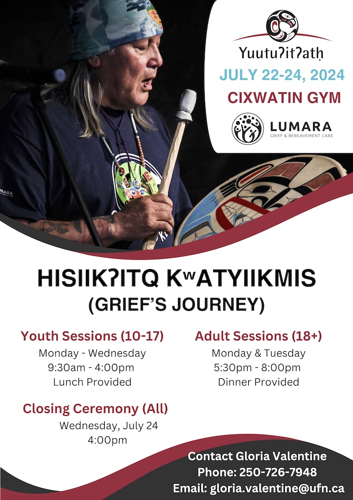 This is an exclusive opportunity for Yuułuʔiłʔath (Ucluelet) members only. Each session is designed to provide a safe space for participants to explore their grief journeys and experience a sense of connection, healing, and hope.