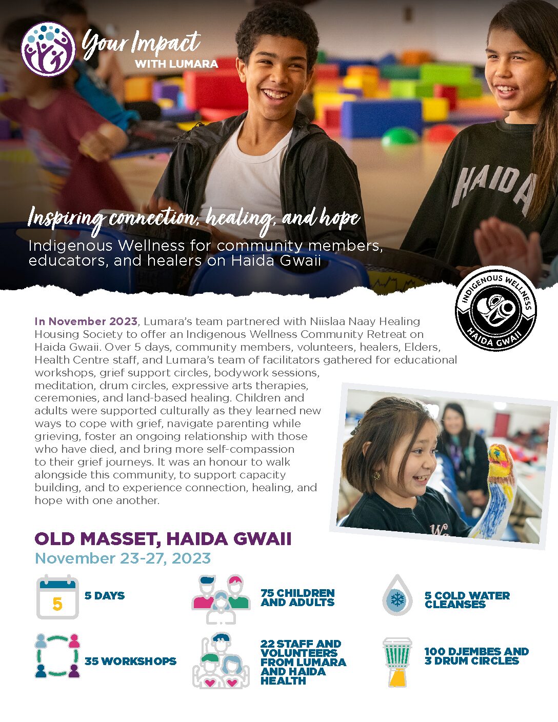 In November 2023, Lumara’s team had the unique opportunity to offer an Indigenous Wellness Community Retreat on Haida Gwaii for community members, educators, and healers. It was a beautiful few days of culturally supported healing, compassion, and building community with those who are grieving.