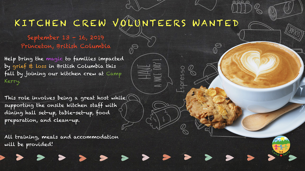 We are currently looking for 20-25 Volunteers to join our 2019 Kitchen Crew for Camp Kerry, British Columbia. Your contribution can provide comfort to dozens of families while also saving the Camp Kerry Society thousands of dollars in staffing costs.
